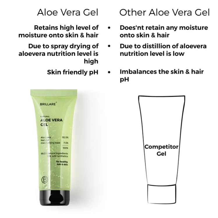 Brillare's Pure Aloe Vera Gel stands apart with its exceptionally high concentration of natural aloe vera (99%) and its commitment to a truly clean formula. Unlike many aloe vera gels that may contain alcohol, artificial colors, or fragrances, our gel is free from these unnecessary additives. We focus on the pure power of aloe vera to deliver effective hydration and soothing relief for skin, scalp, and hair, ensuring a gentle and non-sticky experience that is safe for daily use.