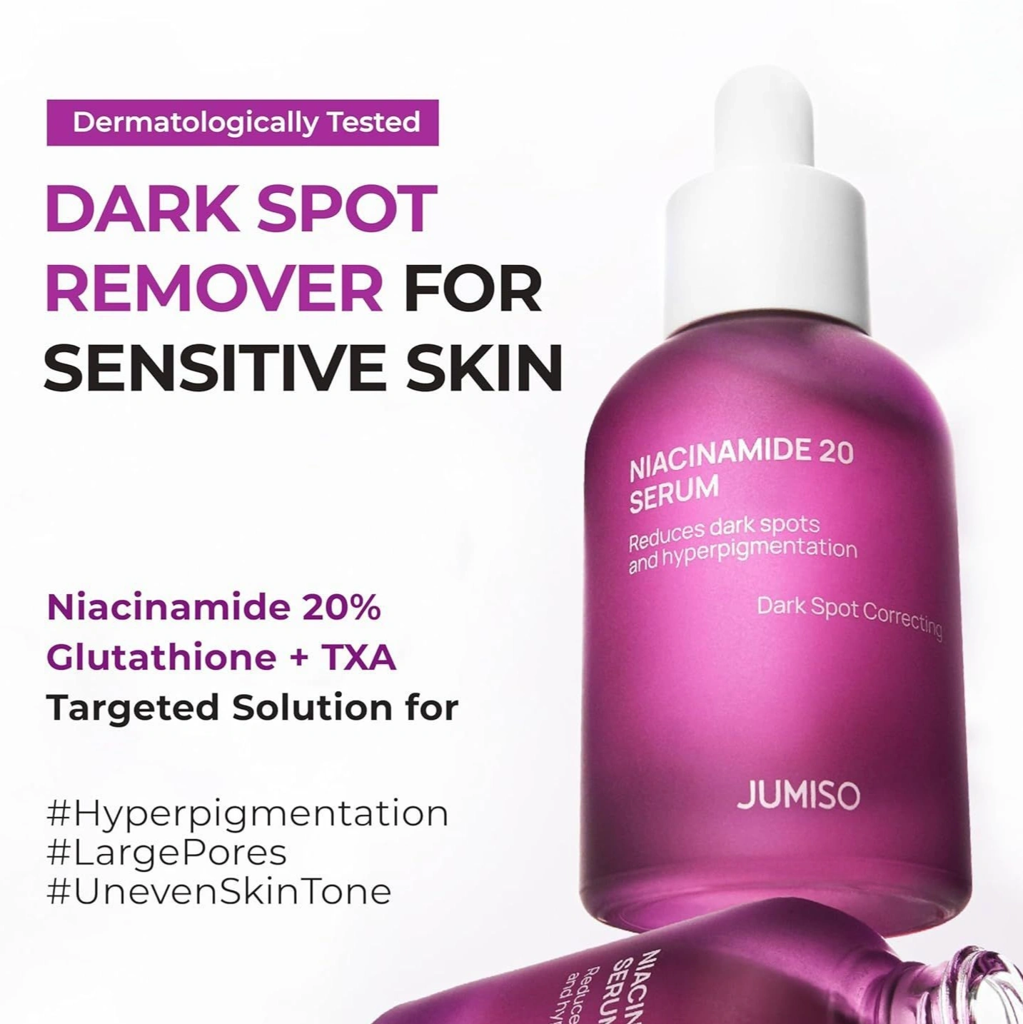 With a highly effective formula containing 20% Niacinamide, Tranexamic Acid (TXA), and Succinic Acid.